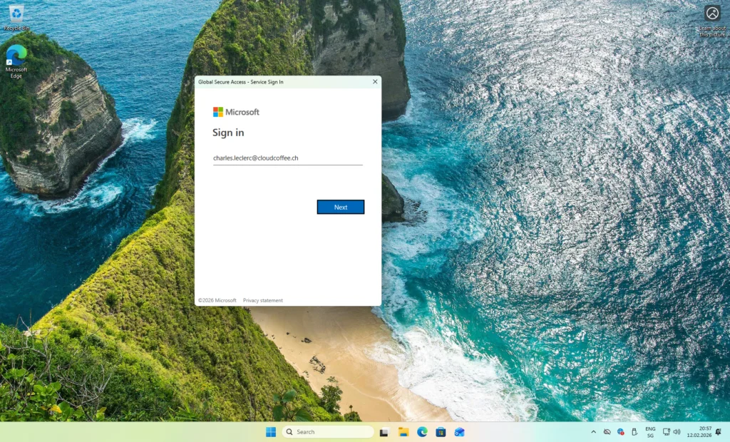 Lors du premier lancement, le Global Secure Access Client initie automatiquement le processus d'enregistrement de l'appareil.