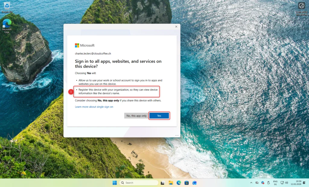 Lorsque le système demande "Sign in to all apps, websites, and services on this device?", sélectionnez Yes. Cette action enregistre l'appareil comme Entra registered dans votre tenant.